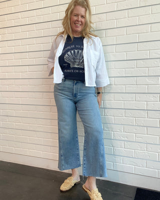 Woman wearing a white jacket, blue jeans, and a graphic t-shirt against a white brick wall.