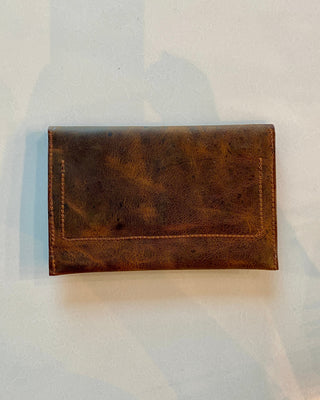 Person wearing a gray t-shirt and blue jeans standing against a wooden wall.