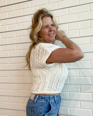 Woman wearing a white crochet top and blue jeans standing against a beige brick wall.