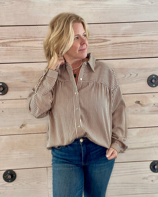 Woman wearing a striped shirt and jeans standing against a wooden wall.