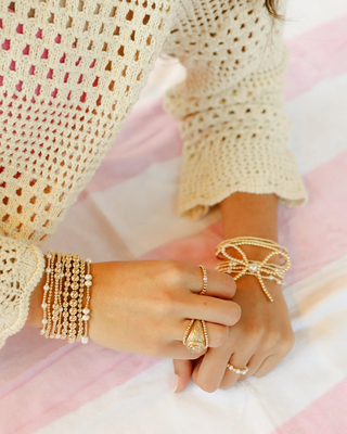Gold bracelet with a pearl on a hand wearing a pink dress.