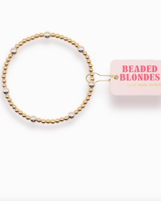 Gold beaded bracelet with a pink tag labeled 'Beaded Blondes' on a white background