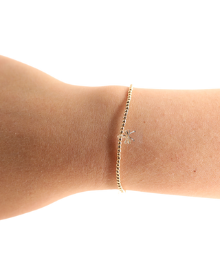 Gold beaded bracelet with 'Beaded Blondes' packaging on a white background