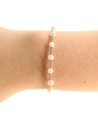 Pearl bracelet with 'Beaded Blondes' packaging on a white background