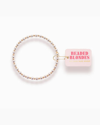 Gold beaded bracelet with pink packaging labeled 'Beaded Blondes' on a white background