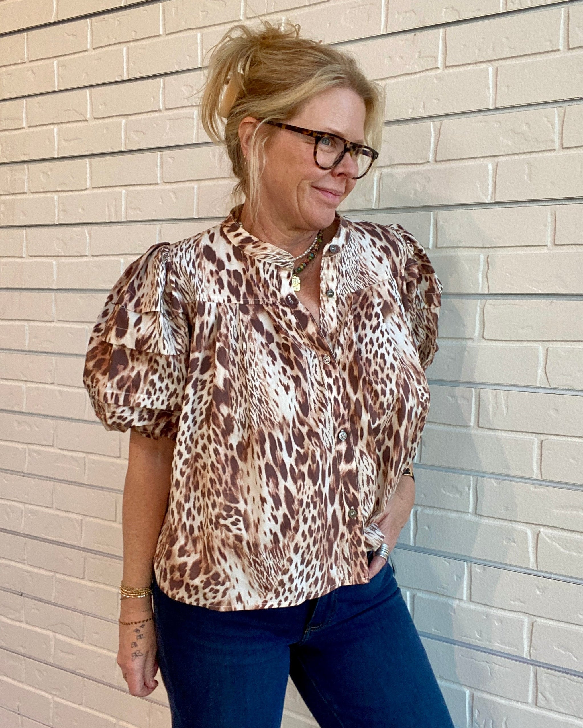 Leopard Bubble Sleeve Button-Down Shirt | Ellipsis Boutique