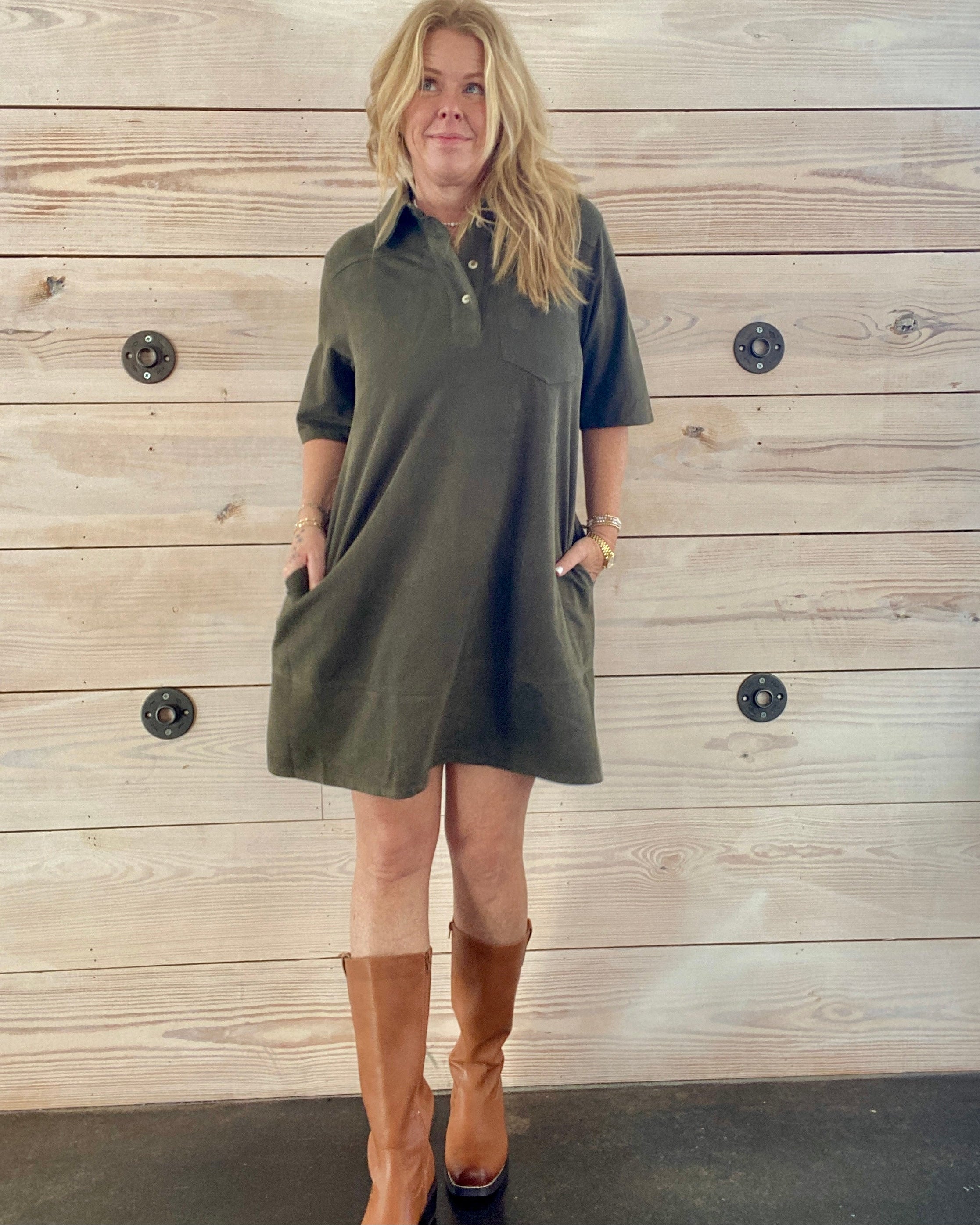 Elevate your everyday wardrobe with this Olive Collared Mini Dress. Featuring a button-front closure and convenient pockets, it combines polished details with effortless style. The soft, slightly stretchy fabric ensures comfort while maintaining a structured silhouette, perfect for transitional fall days.