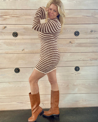 Woman wearing a striped dress and brown boots against a wooden wall.
