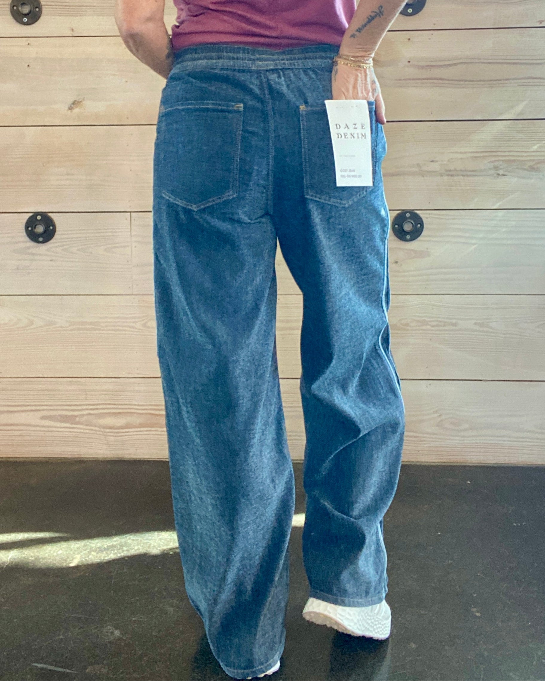 The Cozy Jean Wide Leg Pull On in Sky Whisper by Daze combines laid-back comfort with a polished denim-inspired look. This relaxed, non-stretch silhouette wears like your favorite lounge pant but looks elevated enough for errands or casual outings.