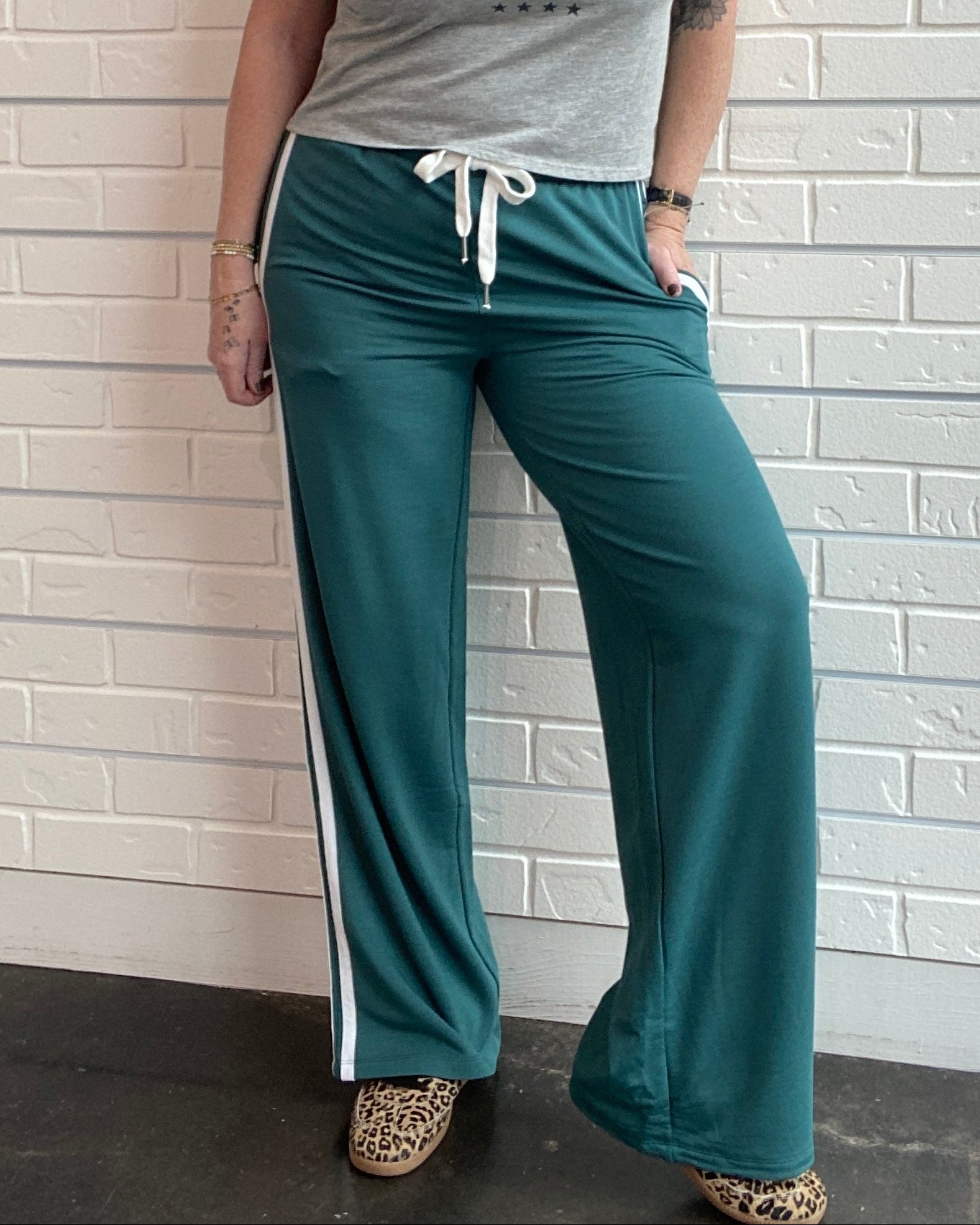 The Sandi Track Pants by Chaser deliver relaxed elegance in a rich teal hue with white accent stripes tracing the seams for understated visual interest. The tapered silhouette balances comfort with refined proportions, making them ideal for both at-home ease and styled outings.