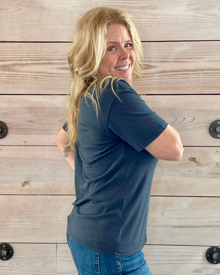Woman wearing a blue t-shirt with a graphic design and gold pants against a wooden background