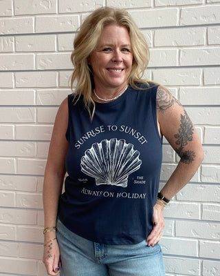 Woman wearing a navy blue sleeveless shirt with a shell design and text, standing against a light brick wall.