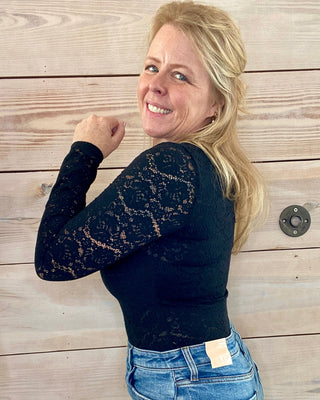 Woman wearing a black long-sleeve top and blue jeans standing against a wooden wall.