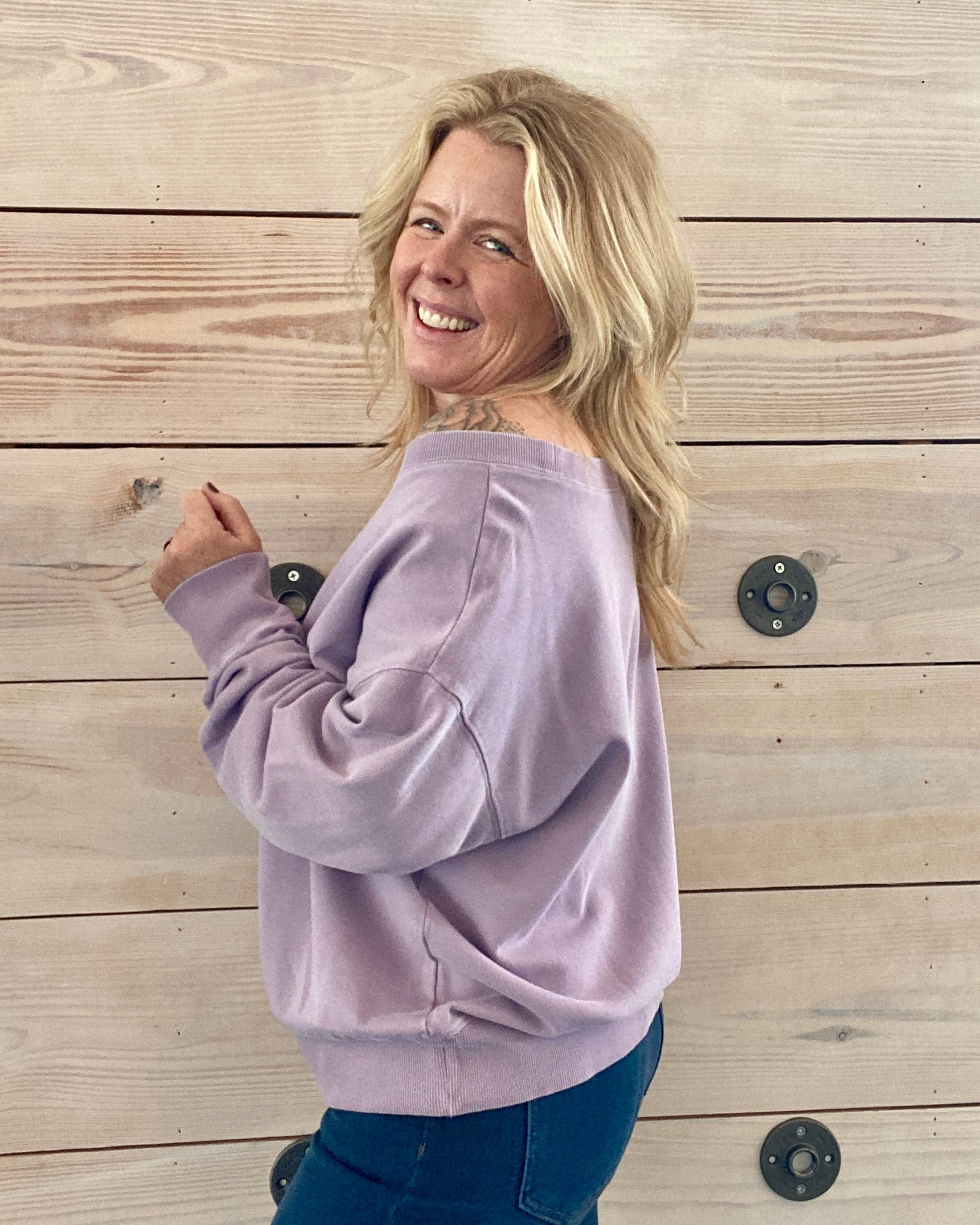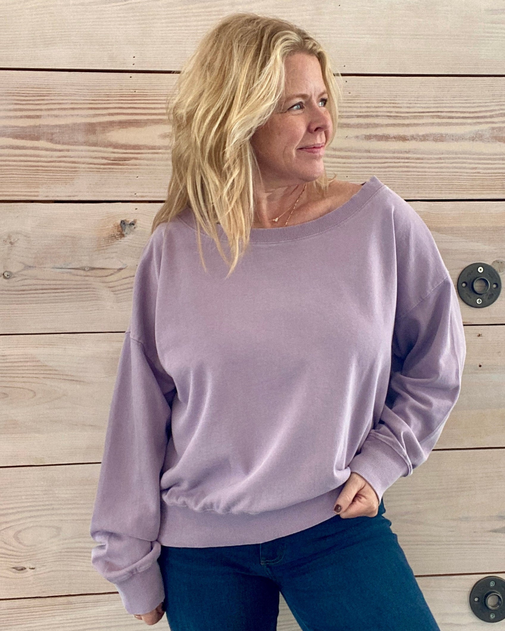 Effortlessly chic with a relaxed edge, the Bellini Pullover in rich amethyst purple brings elevated comfort to your everyday wardrobe. Designed with a flattering off-the-shoulder silhouette and ultra-soft cotton feel, this pullover blends laid-back lounge vibes with polished style. Cuffed sleeves and a comfortable waistband give it just enough structure, making it perfect for casual days that still call for a pulled-together look.