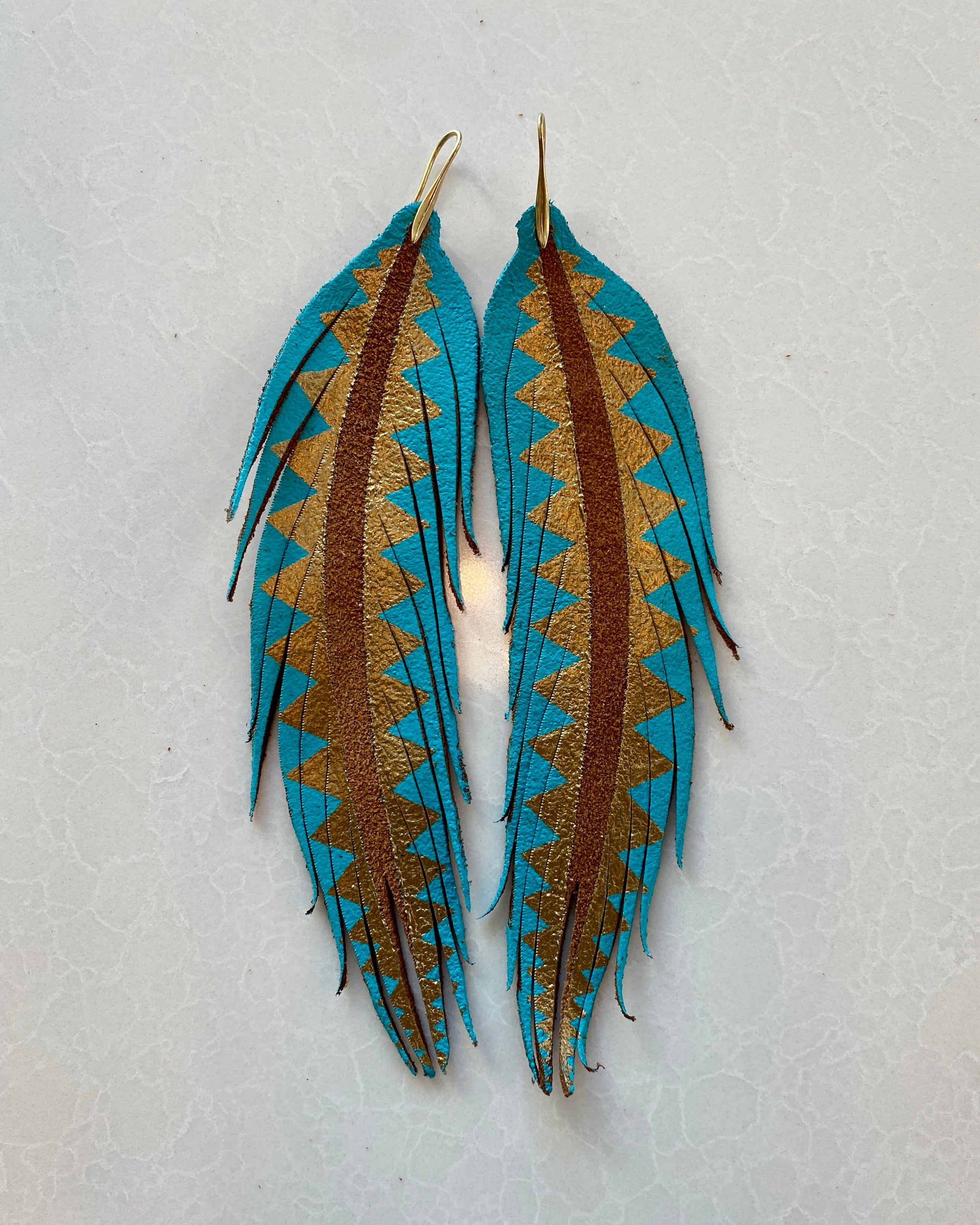 Long Triangle Gold and Turquoise Feather Earrings – Ellipsis Boutique